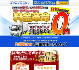 クリーンセレクトの特徴は年間実績3000件以上という高い経験を誇り、利用者の満足度が98.7%という安心感です。料金面でも非常にリーズナブルとなっており、出張料金はもちろん車両代や基本料も無料となっており、作業費のみで対応している点が魅力の1つです。